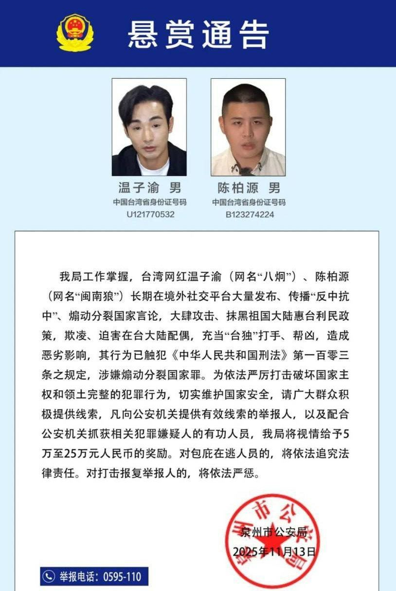11月13日,福建省泉州市公安局发布悬赏通告,征集台湾网红温子渝(网名“八炯”)、陈柏源(网名“闽南狼”)违法犯罪线索。